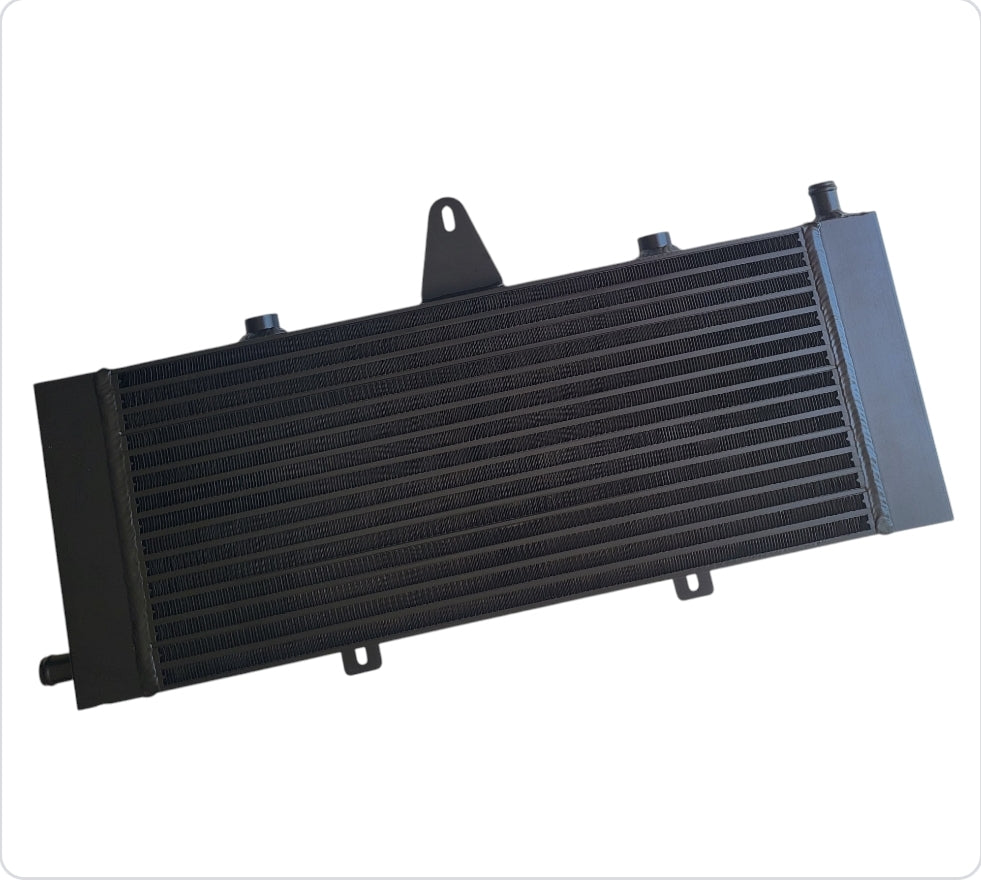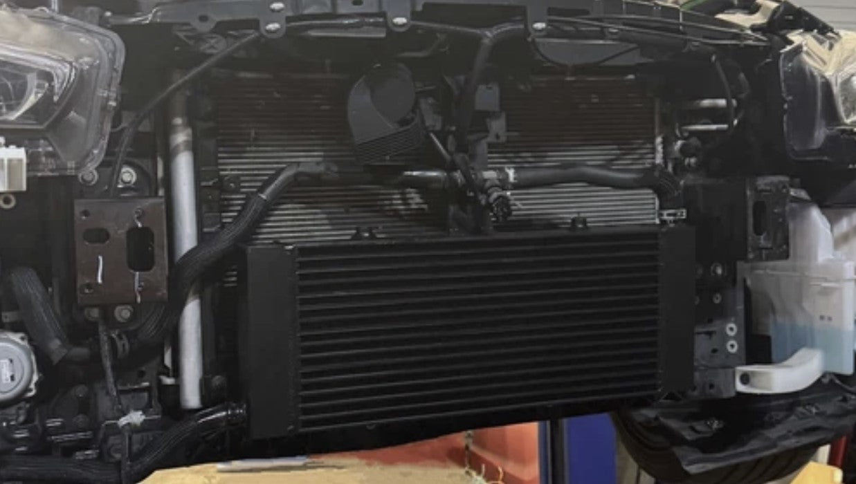 - 5X the Fluid Capacity: With over 5x the fluid volume of the stock unit, this heat exchanger maintains consistent cooling performance, even during repeated high-boost runs.